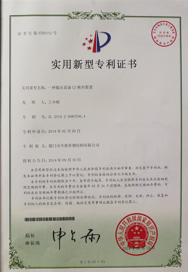 Certificado de patente da máquina de conformação de rolos de intercâmbio CZ